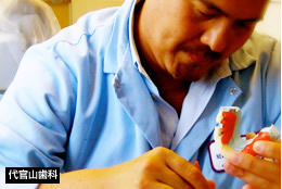お口の中そっくりの模型に人工の歯をつけてみます。模型上でインプラントを入れた後の理想の状態を作ってみるのです。インプラントの上に装着する新しい歯の形を決め、その新しい歯を支えるためには、どこへどの角度でインプラントを埋め込むのが理想かを計算します。患者様にとっても、このワックスアップを見ることで、インプラント後の自分の歯の並びがどのようになるかが分かり、治療についての理解が深まると考えます。